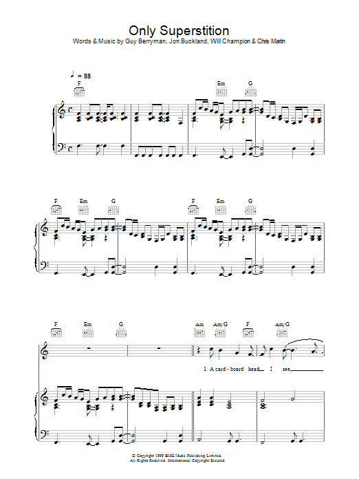 Download or print Coldplay Only Superstition sheet music, chords and digital score arranged for Guitar Chords/Lyrics. This Rock score includes 2 page(s).
