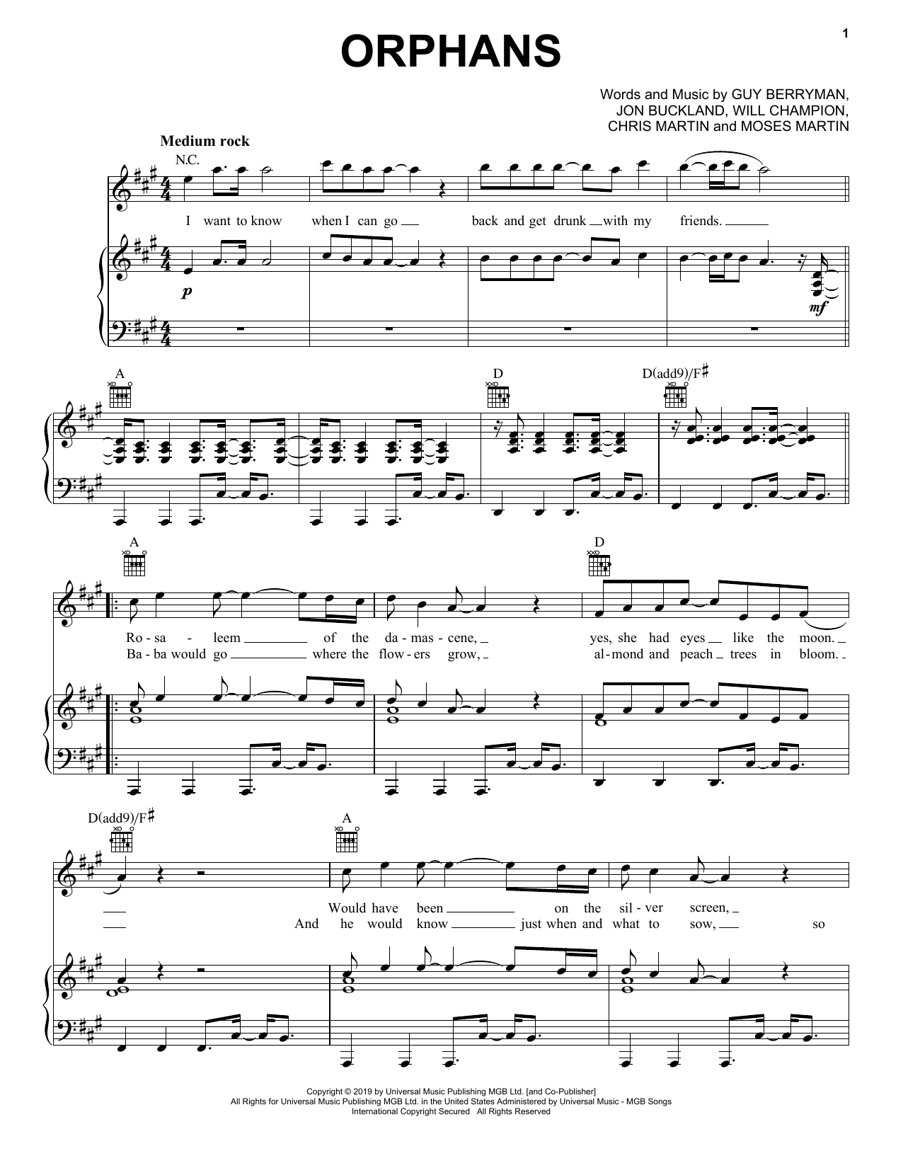 Download or print Coldplay Orphans sheet music, chords and digital score arranged for Piano, Vocal & Guitar Chords (Right-Hand Melody). This Pop score includes 5 page(s).
