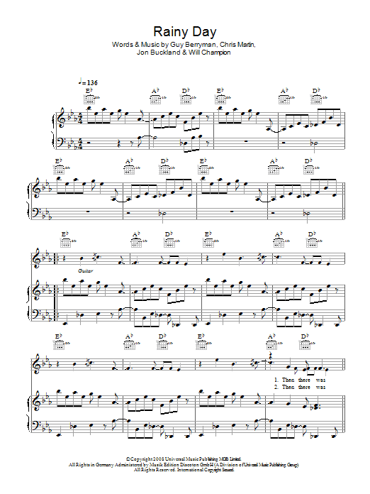 Download or print Coldplay Rainy Day sheet music, chords and digital score arranged for Guitar Chords/Lyrics. This Rock score includes 2 page(s).