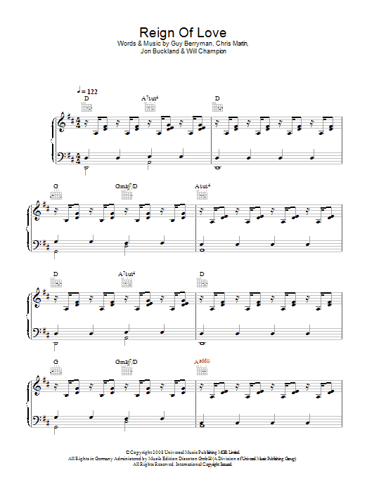 Download or print Coldplay Reign Of Love sheet music, chords and digital score arranged for Guitar Chords/Lyrics. This Rock score includes 2 page(s).
