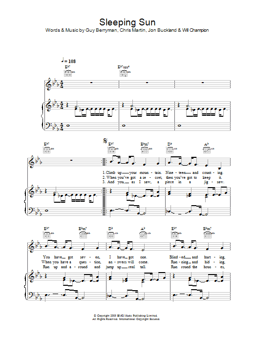 Download or print Coldplay Sleeping Sun sheet music, chords and digital score arranged for Guitar Tab. This Pop score includes 4 page(s).