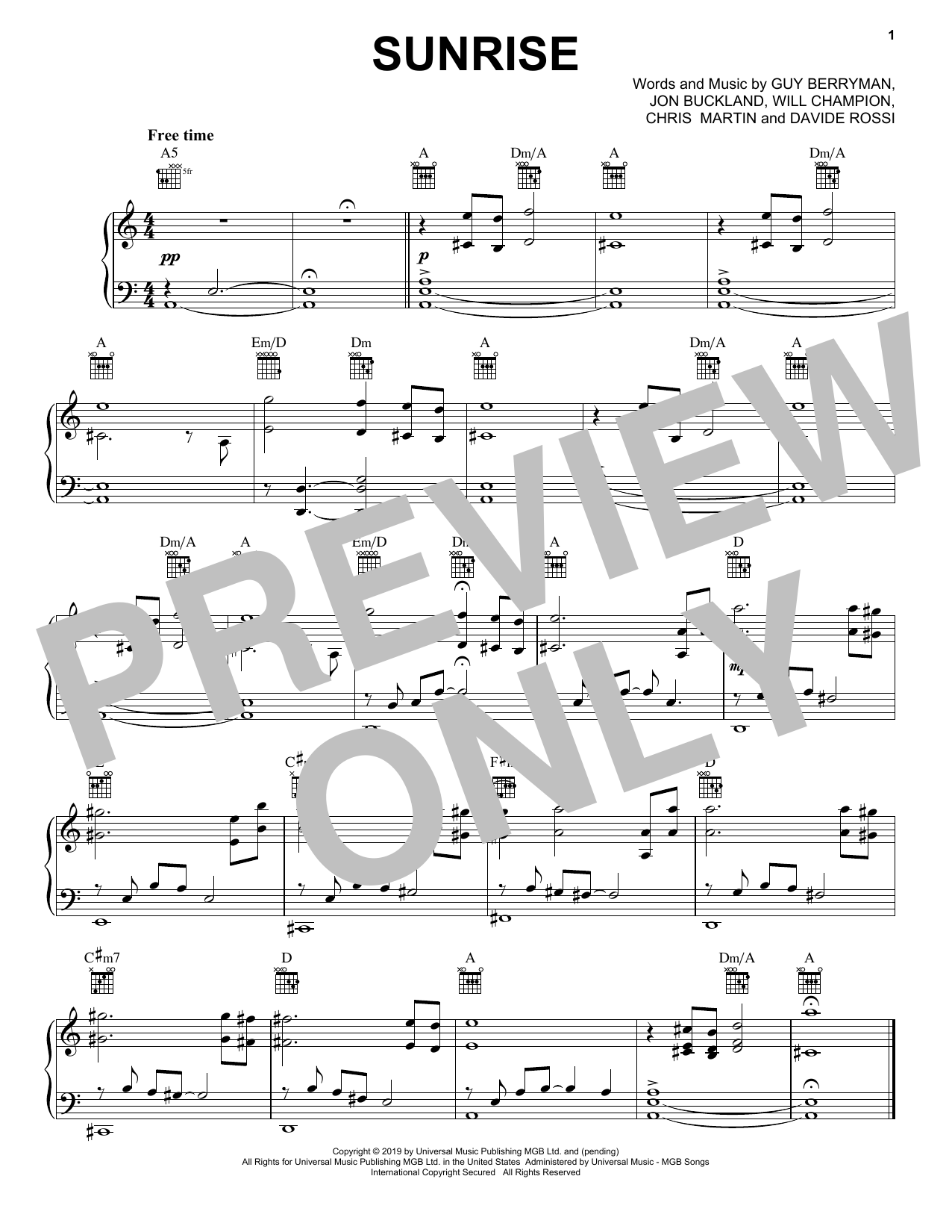 Download or print Coldplay Sunrise sheet music, chords and digital score arranged for Piano, Vocal & Guitar Chords (Right-Hand Melody). This Pop score includes 1 page(s).