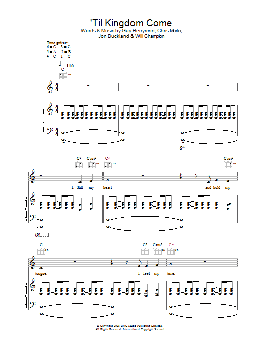 Download or print Coldplay Til Kingdom Come sheet music, chords and digital score arranged for Lead Sheet / Fake Book. This Pop score includes 3 page(s).