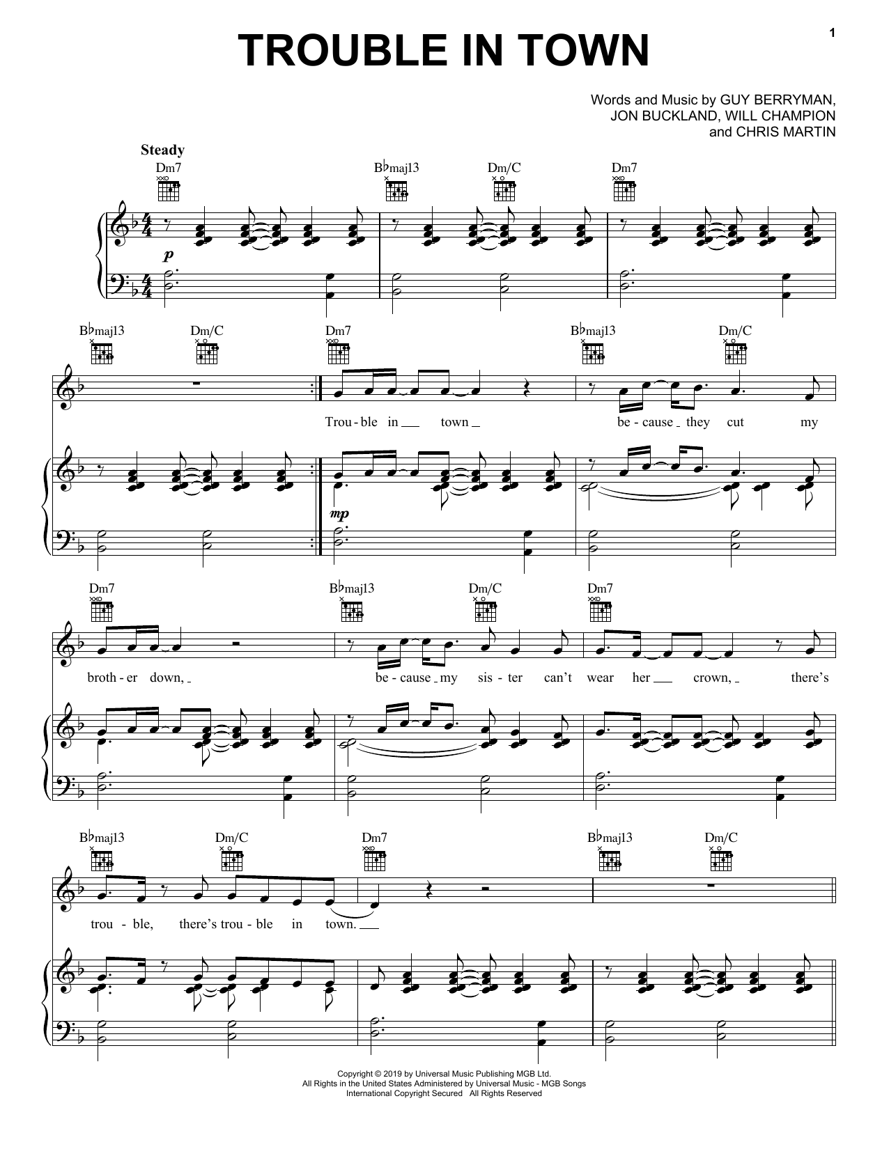 Download or print Coldplay Trouble In Town sheet music, chords and digital score arranged for Piano, Vocal & Guitar Chords (Right-Hand Melody). This Pop score includes 7 page(s).