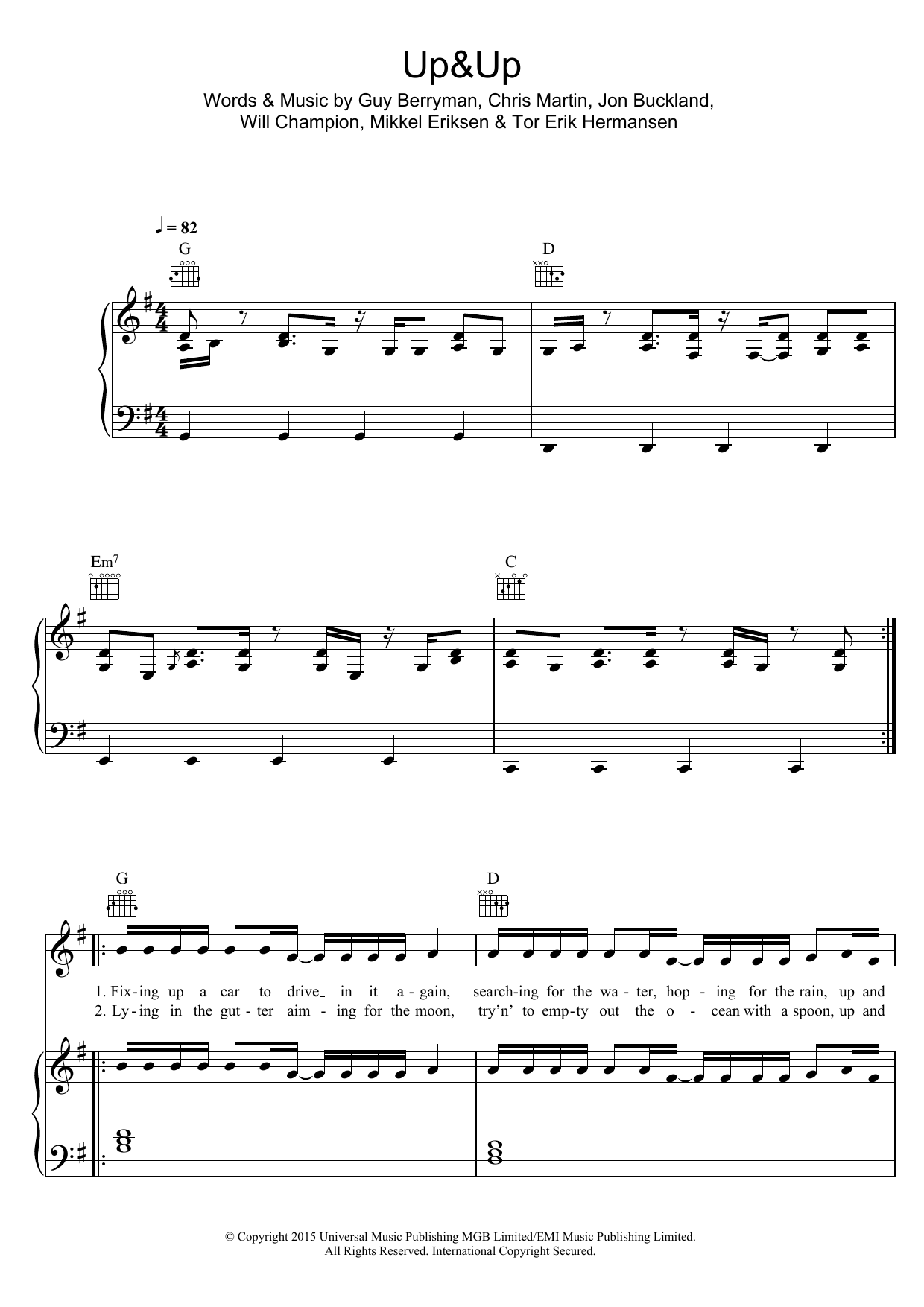 Download or print Coldplay Up and Up sheet music, chords and digital score arranged for Piano, Vocal & Guitar Chords. This Pop score includes 9 page(s).