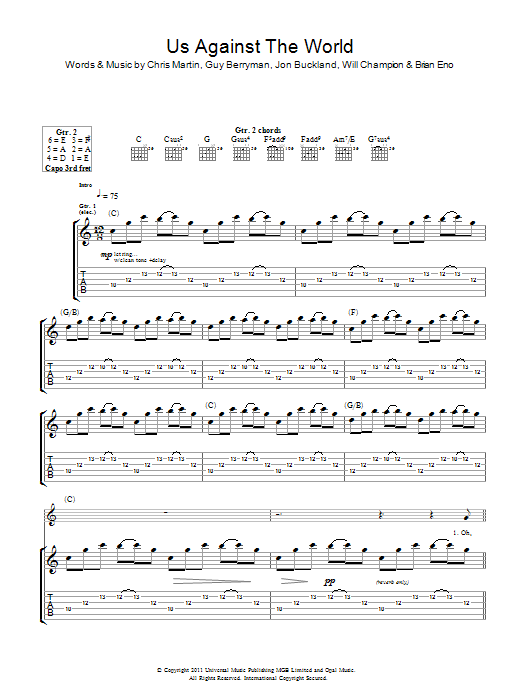 Download or print Coldplay Us Against The World sheet music, chords and digital score arranged for Guitar Tab. This Pop score includes 5 page(s).