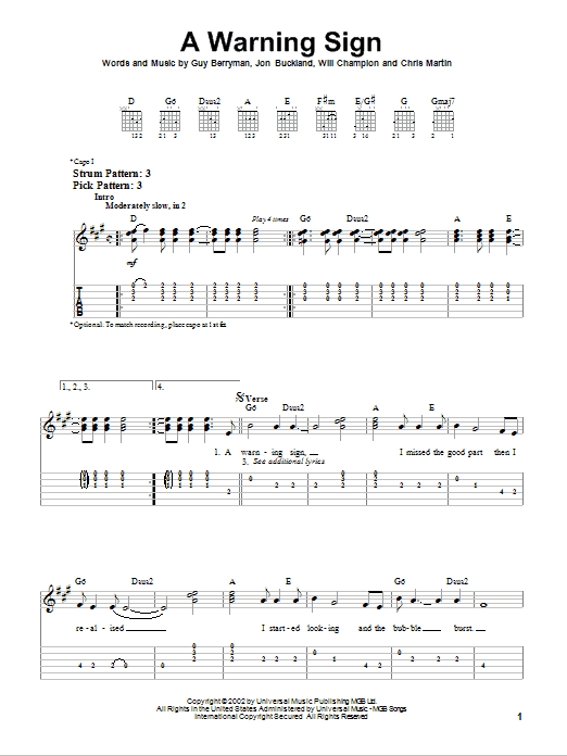 Download or print Coldplay A Warning Sign sheet music, chords and digital score arranged for Easy Guitar Tab. This Pop score includes 4 page(s).