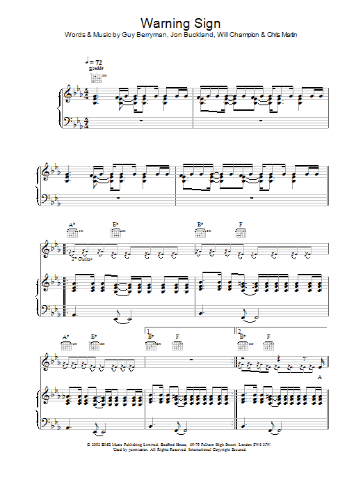 Download or print Coldplay Warning Sign sheet music, chords and digital score arranged for Piano Chords/Lyrics. This Pop score includes 2 page(s).