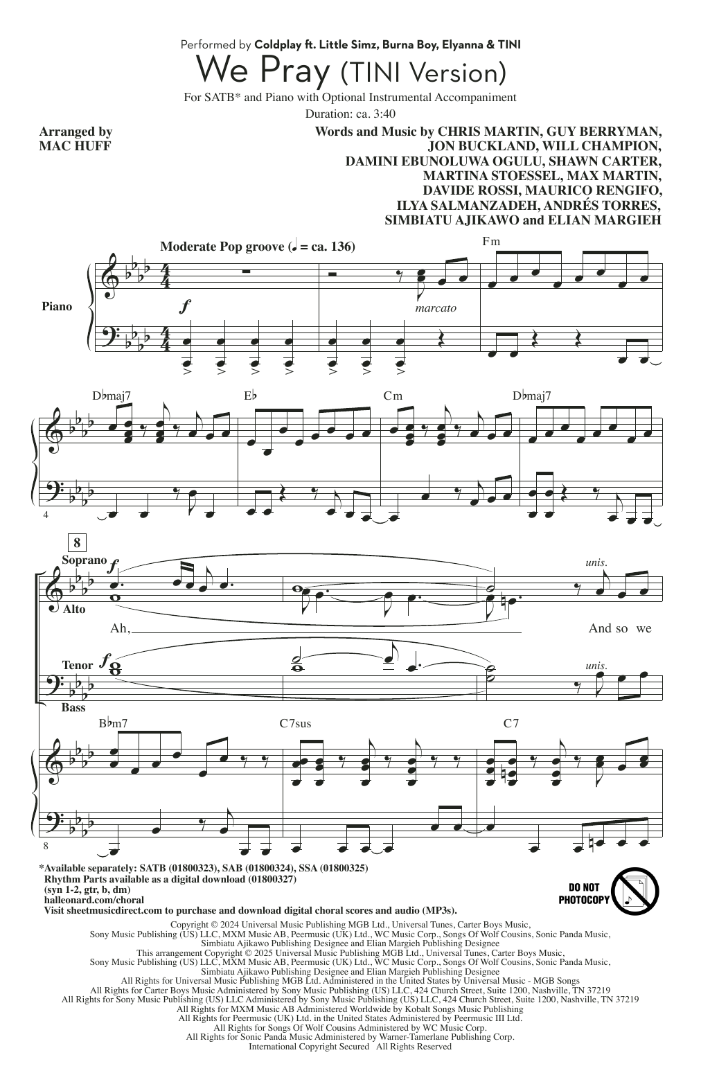 Download or print Coldplay We Pray - Tini Version (arr. Mac Huff) sheet music, chords and digital score arranged for SSA Choir. This Inspirational score includes 15 page(s).