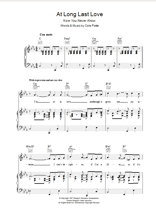 Download or print Cole Porter At Long Last Love sheet music, chords and digital score arranged for Real Book – Melody & Chords – C Instruments. This Jazz score includes 1 page(s).
