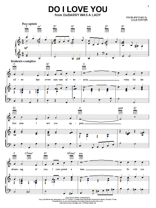 Download or print Cole Porter Do I Love You sheet music, chords and digital score arranged for Piano, Vocal & Guitar Chords (Right-Hand Melody). This Love score includes 5 page(s).
