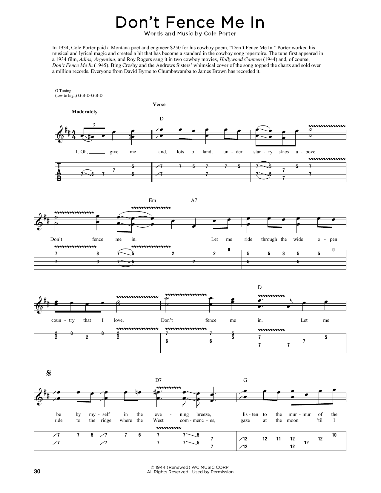 Download or print Cole Porter Don't Fence Me In (arr. Fred Sokolow) sheet music, chords and digital score arranged for Guitar Tab. This Country score includes 2 page(s).