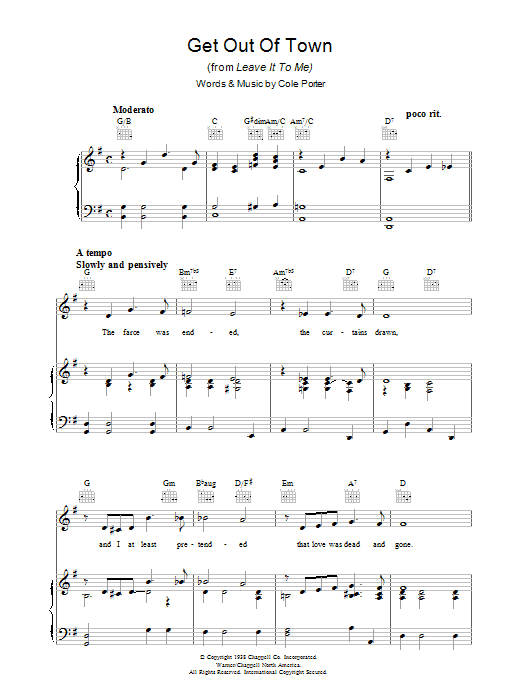Download or print Cole Porter Get Out Of Town sheet music, chords and digital score arranged for Real Book – Melody, Lyrics & Chords. This Jazz score includes 1 page(s).