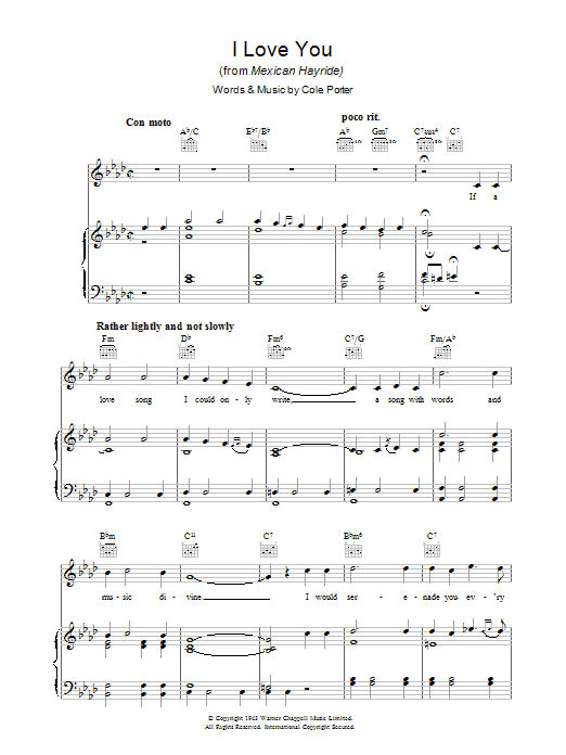 Download or print Cole Porter I Love You sheet music, chords and digital score arranged for Piano, Vocal & Guitar Chords (Right-Hand Melody). This Love score includes 6 page(s).