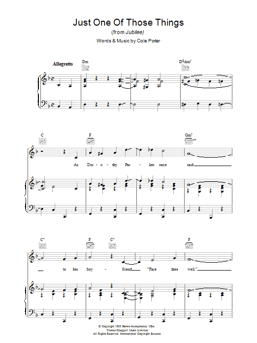 Download or print Cole Porter Just One Of Those Things sheet music, chords and digital score arranged for Piano, Vocal & Guitar Chords. This Jazz score includes 9 page(s).