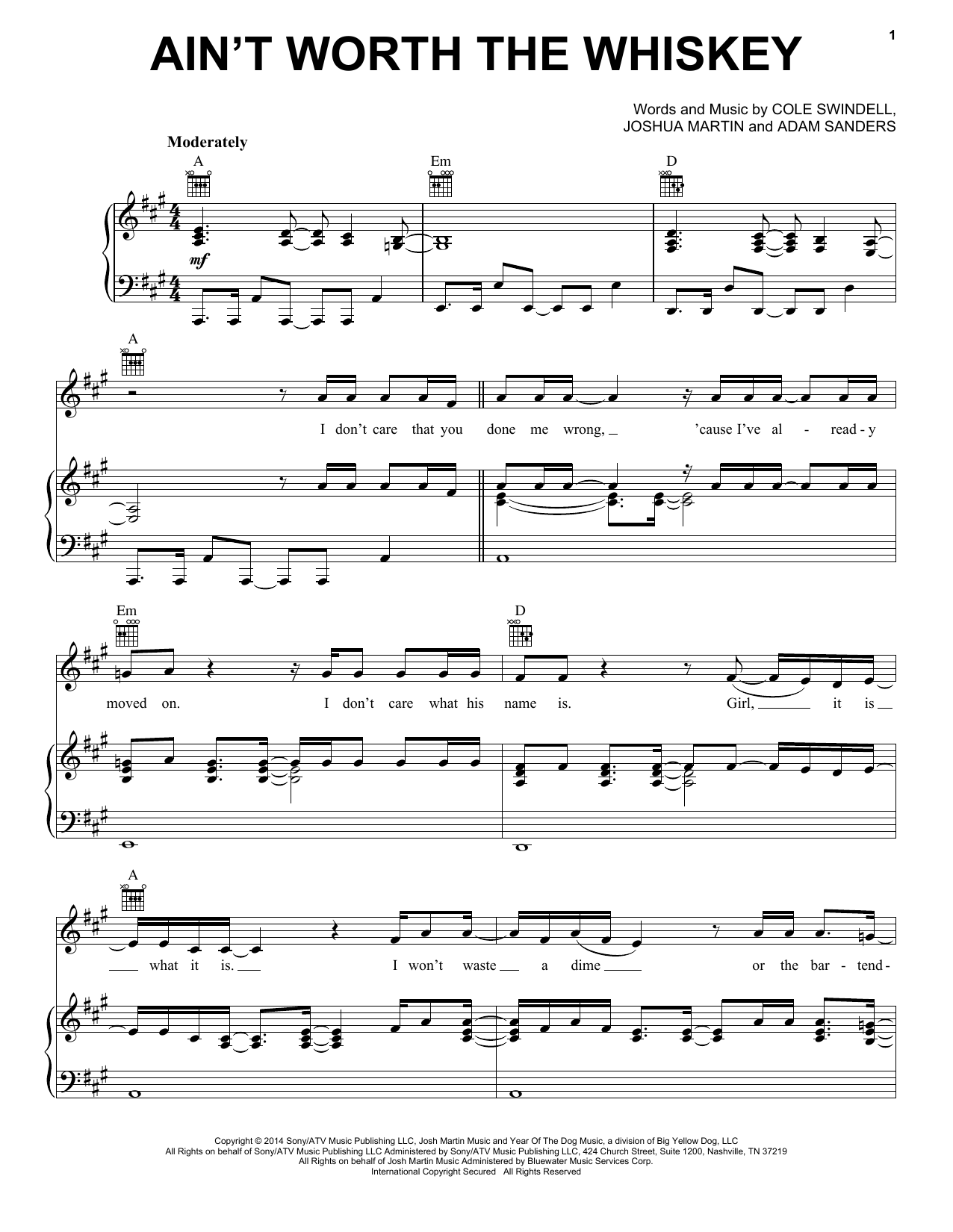 Download or print Cole Swindell Ain't Worth The Whiskey sheet music, chords and digital score arranged for Piano, Vocal & Guitar Chords (Right-Hand Melody). This Pop score includes 6 page(s).