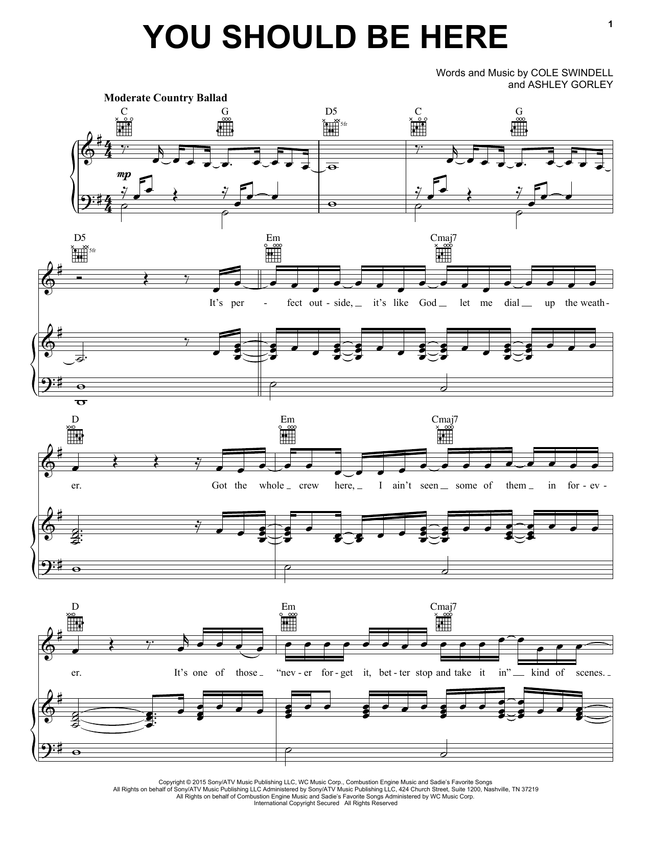 Download or print Cole Swindell You Should Be Here sheet music, chords and digital score arranged for Easy Piano. This Pop score includes 5 page(s).