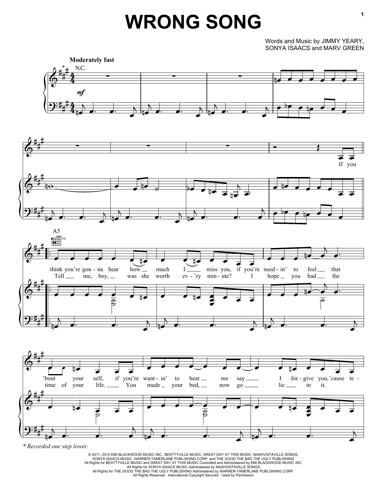 Download or print Connie Britton and Hayden Panettiere Wrong Song sheet music, chords and digital score arranged for Piano, Vocal & Guitar Chords (Right-Hand Melody). This Pop score includes 5 page(s).