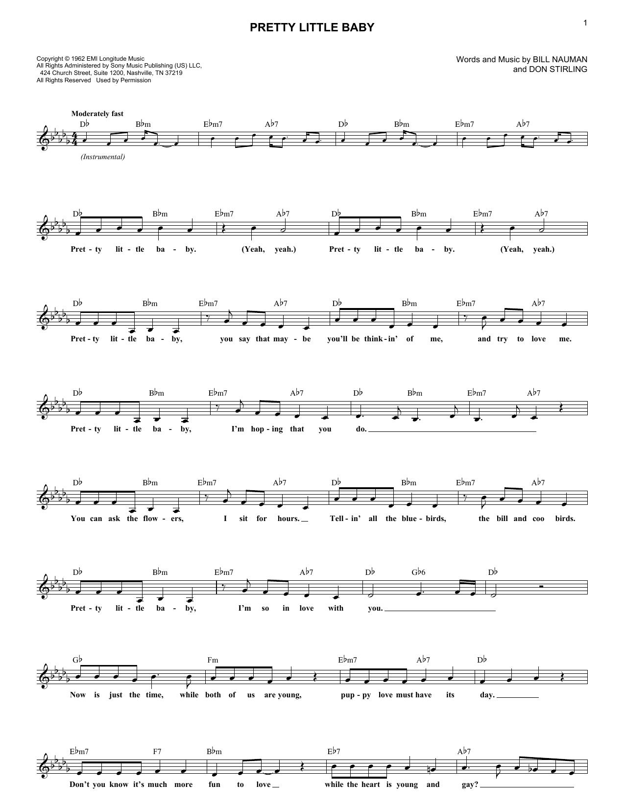 Download or print Connie Francis Pretty Little Baby sheet music, chords and digital score arranged for Lead Sheet / Fake Book. This Pop score includes 2 page(s).