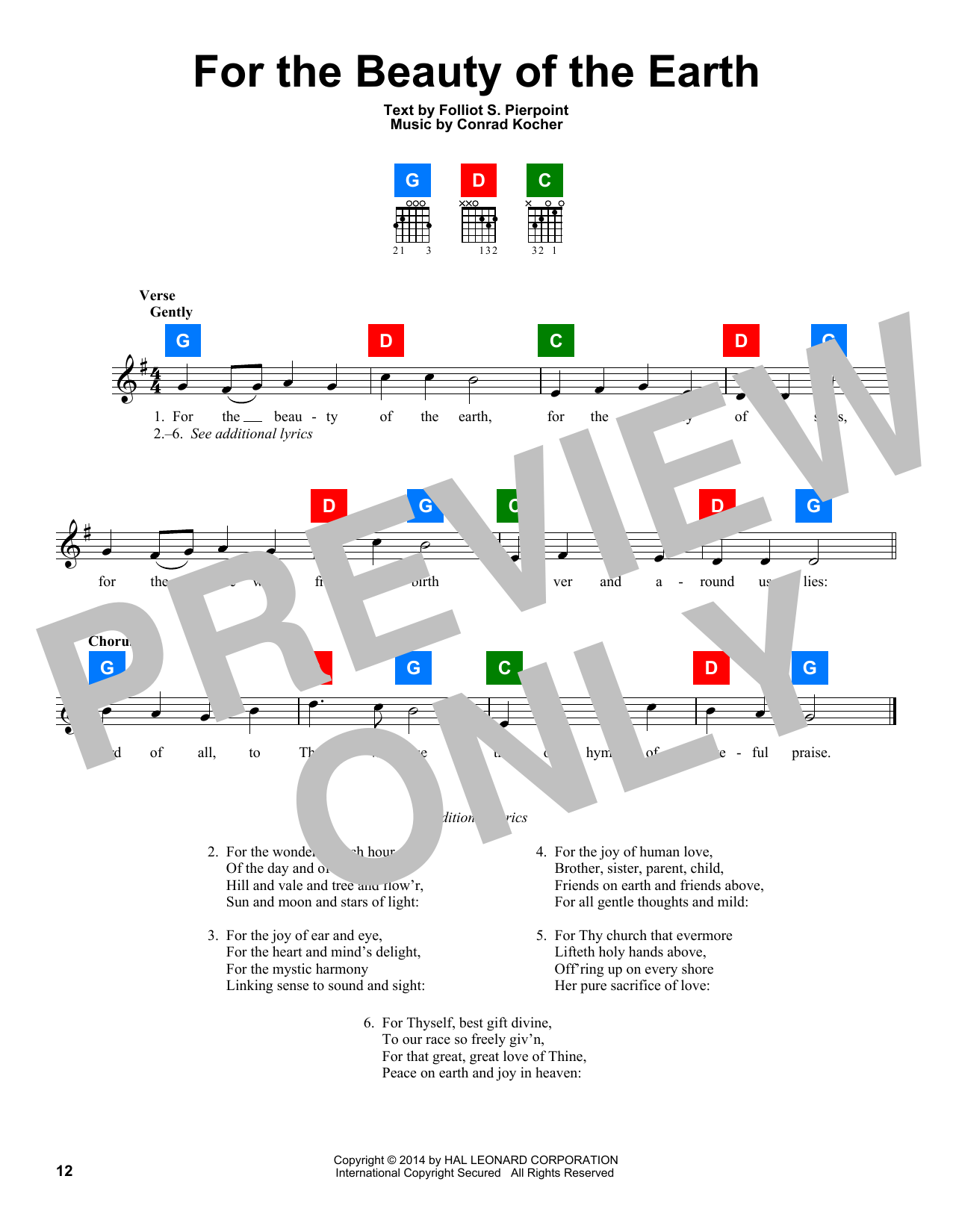 Download or print Conrad Kocher For The Beauty Of The Earth sheet music, chords and digital score arranged for Super Easy Piano. This Sacred score includes 1 page(s).