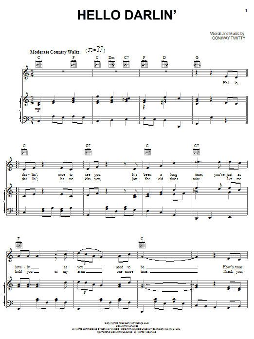 Download or print Conway Twitty Hello Darlin' sheet music, chords and digital score arranged for Super Easy Piano. This Country score includes 2 page(s).