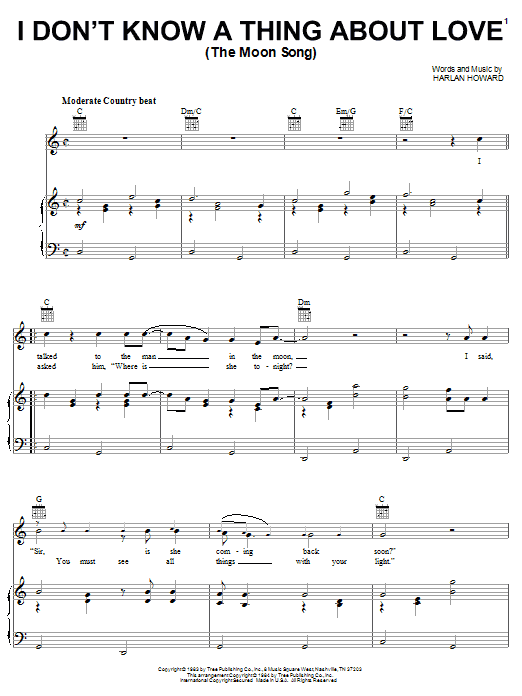 Download or print Conway Twitty I Don't Know A Thing About Love (The Moon Song) sheet music, chords and digital score arranged for Piano, Vocal & Guitar Chords (Right-Hand Melody). This Country score includes 4 page(s).