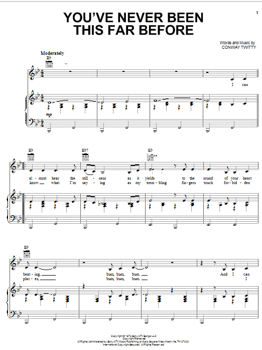 Download or print Conway Twitty You've Never Been This Far Before sheet music, chords and digital score arranged for Piano, Vocal & Guitar Chords (Right-Hand Melody). This Country score includes 4 page(s).