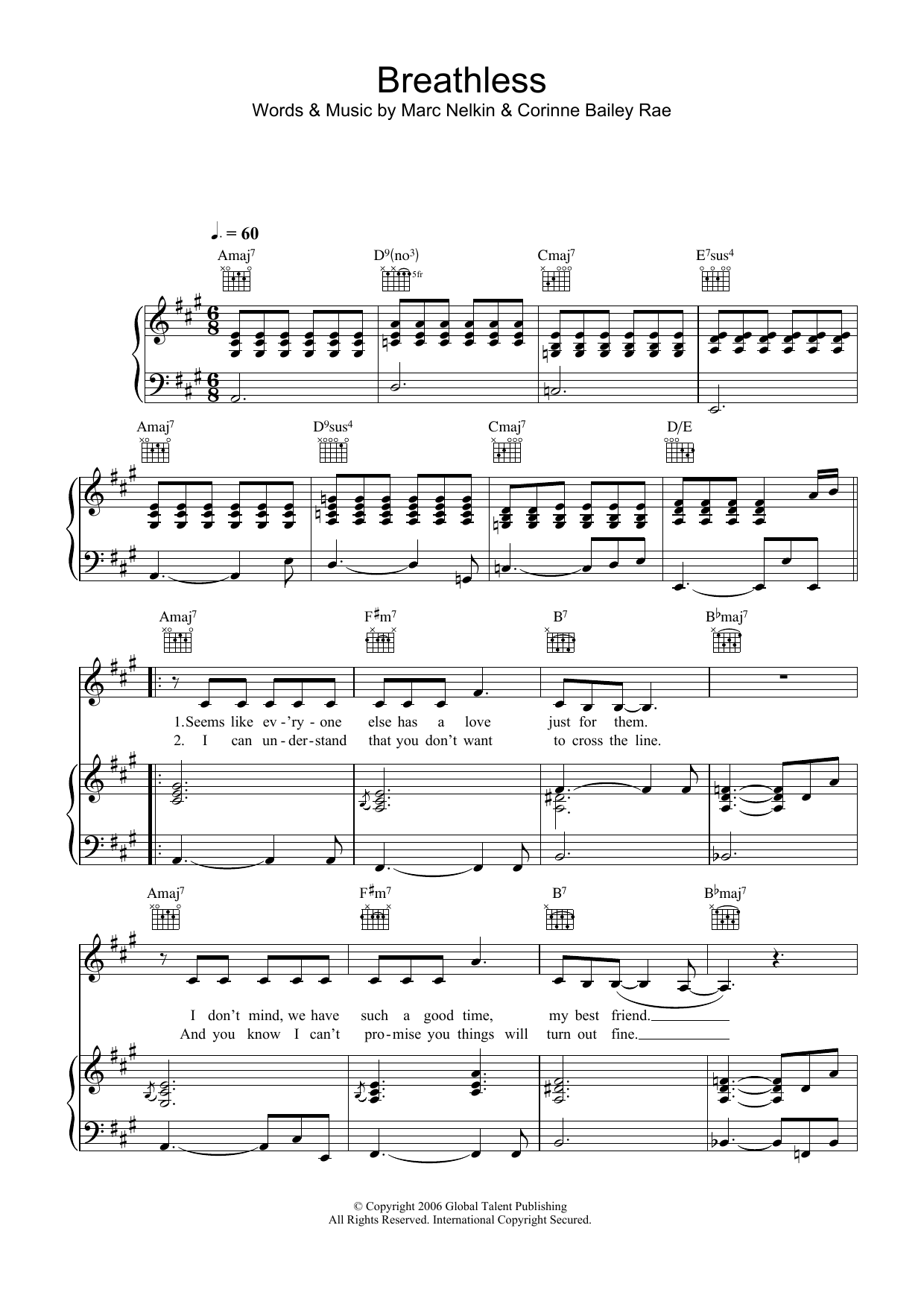 Download or print Corinne Bailey Rae Breathless sheet music, chords and digital score arranged for Easy Piano. This Pop score includes 6 page(s).
