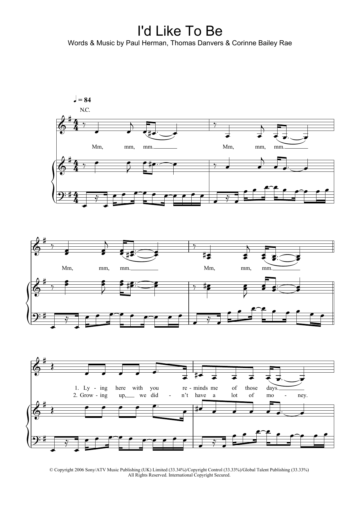 Download or print Corinne Bailey Rae I'd Like To sheet music, chords and digital score arranged for Easy Piano. This Pop score includes 4 page(s).