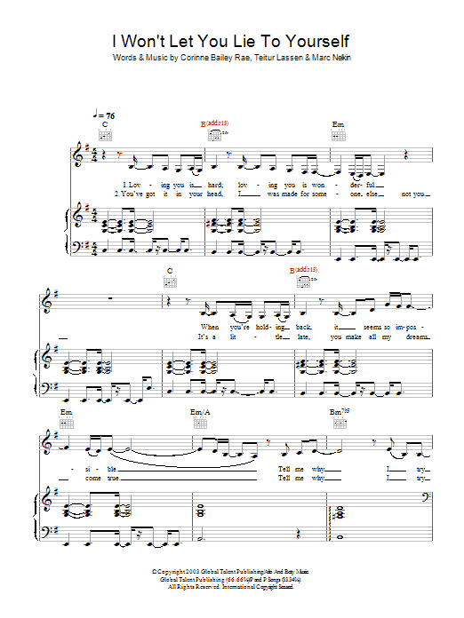 Download or print Corinne Bailey Rae I Won't Let You Lie To Yourself sheet music, chords and digital score arranged for Guitar Chords/Lyrics. This Pop score includes 2 page(s).