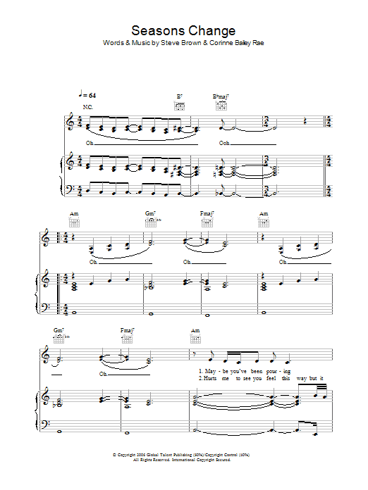 Download or print Corinne Bailey Rae Seasons Change sheet music, chords and digital score arranged for Piano, Vocal & Guitar Chords. This Pop score includes 5 page(s).