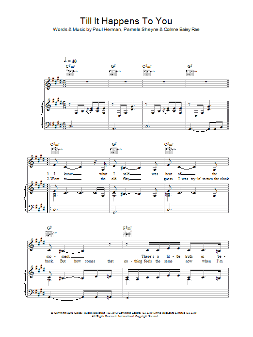Download or print Corinne Bailey Rae Till It Happens To You sheet music, chords and digital score arranged for Piano, Vocal & Guitar Chords. This Pop score includes 5 page(s).