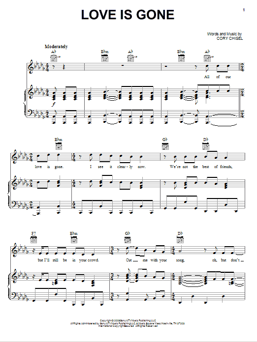 Download or print Cory Chisel And The Wandering Sons Love Is Gone sheet music, chords and digital score arranged for Piano, Vocal & Guitar Chords (Right-Hand Melody). This Folk score includes 5 page(s).