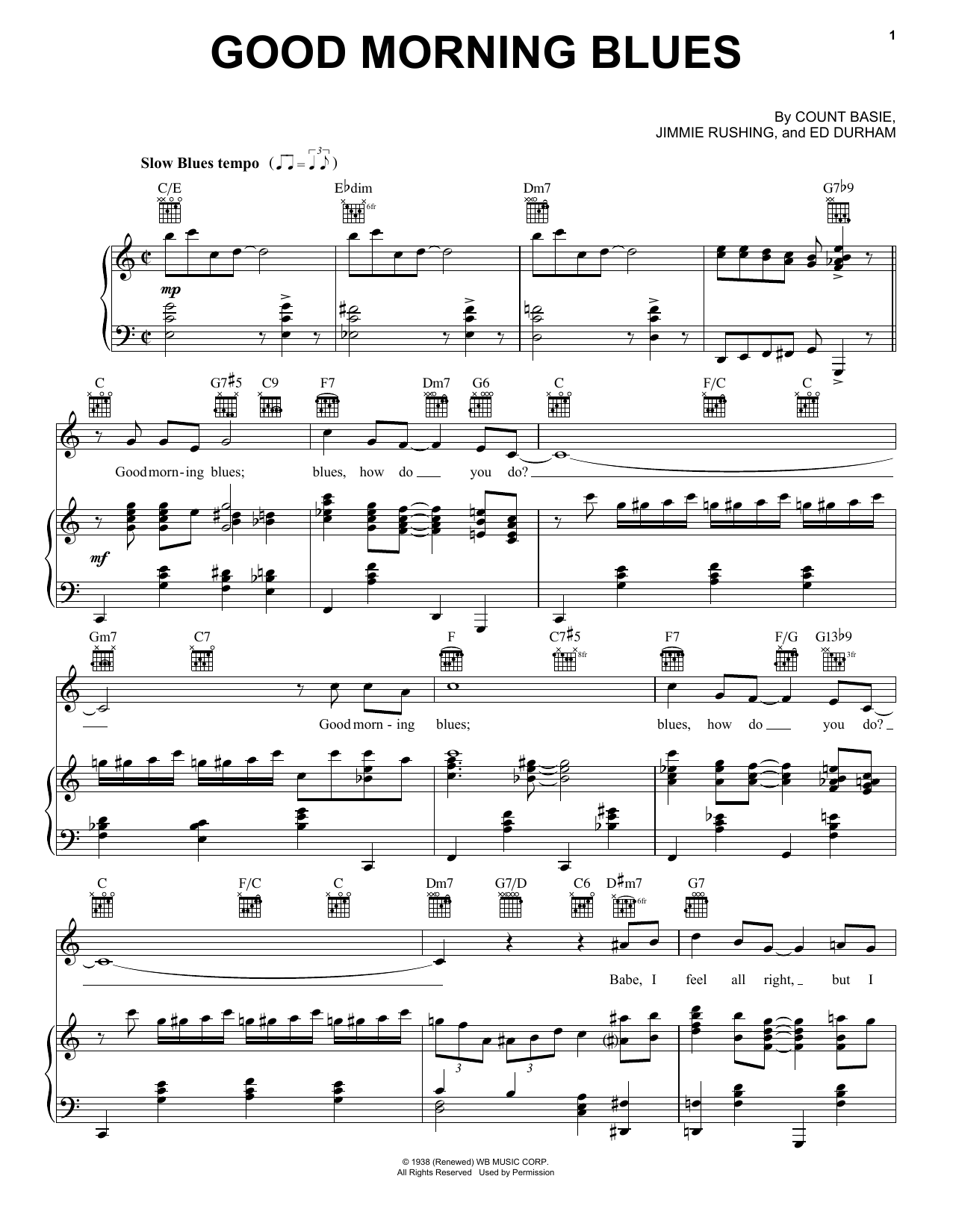 Download or print Count Basie Good Morning Blues sheet music, chords and digital score arranged for Piano, Vocal & Guitar Chords (Right-Hand Melody). This Jazz score includes 3 page(s).