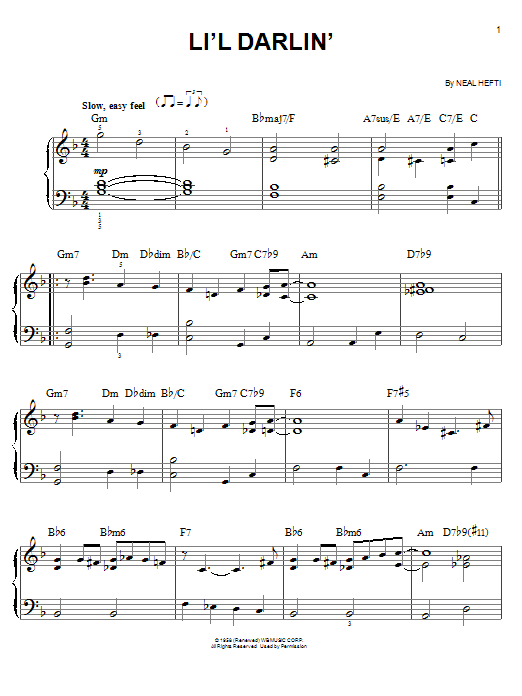 Download or print Count Basie Li'l Darlin' sheet music, chords and digital score arranged for Piano, Vocal & Guitar Chords (Right-Hand Melody). This Jazz score includes 3 page(s).