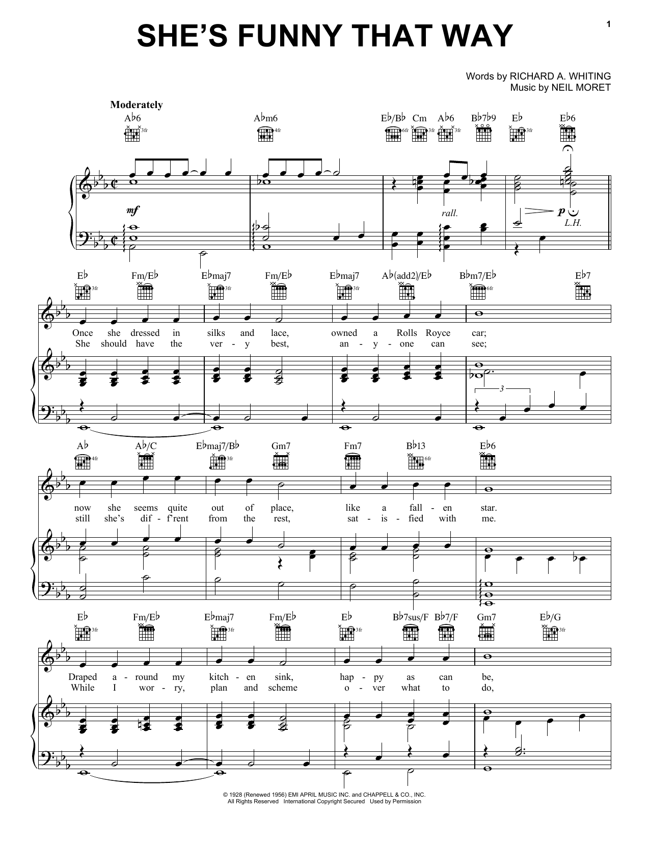 Download or print Count Basie She's Funny That Way sheet music, chords and digital score arranged for Piano, Vocal & Guitar Chords (Right-Hand Melody). This Jazz score includes 4 page(s).