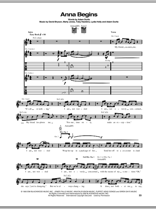 Download or print Counting Crows Anna Begins sheet music, chords and digital score arranged for Guitar Tab. This Pop score includes 9 page(s).