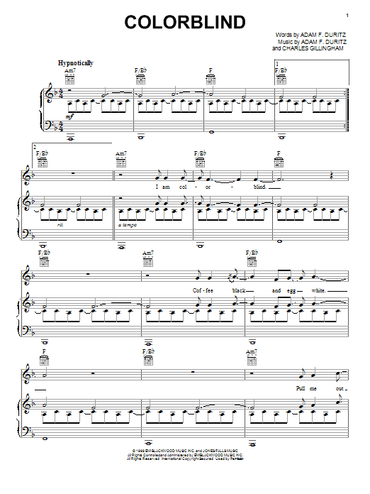 Download or print Counting Crows Colorblind sheet music, chords and digital score arranged for Piano, Vocal & Guitar Chords (Right-Hand Melody). This Pop score includes 6 page(s).