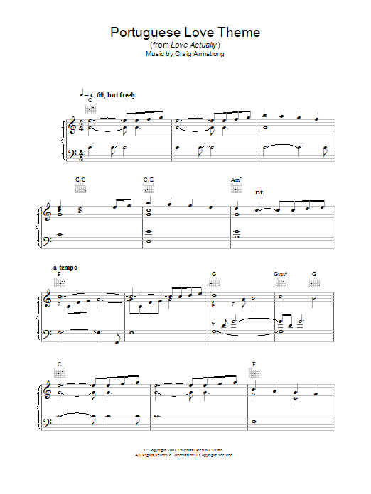 Download or print Craig Armstrong Portuguese Love Theme (from Love Actually) sheet music, chords and digital score arranged for Piano Solo. This Film/TV score includes 3 page(s).