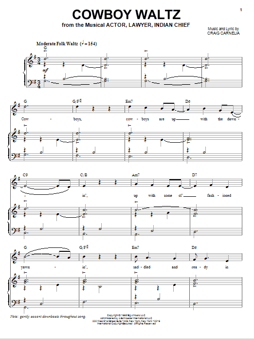 Download or print Craig Carnelia Cowboy Waltz sheet music, chords and digital score arranged for Piano & Vocal. This Broadway score includes 11 page(s).
