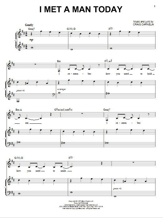 Download or print Craig Carnelia I Met A Man Today sheet music, chords and digital score arranged for Piano & Vocal. This Musical/Show score includes 9 page(s).