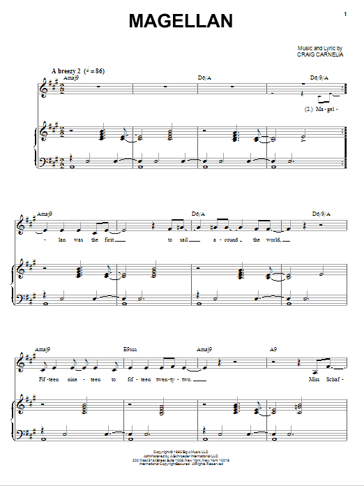 Download or print Craig Carnelia Magellan sheet music, chords and digital score arranged for Piano & Vocal. This Broadway score includes 7 page(s).