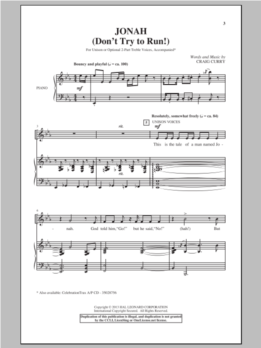 Download or print Craig Curry Jonah (Don't Try To Run!) sheet music, chords and digital score arranged for Unison Choir. This Concert score includes 10 page(s).