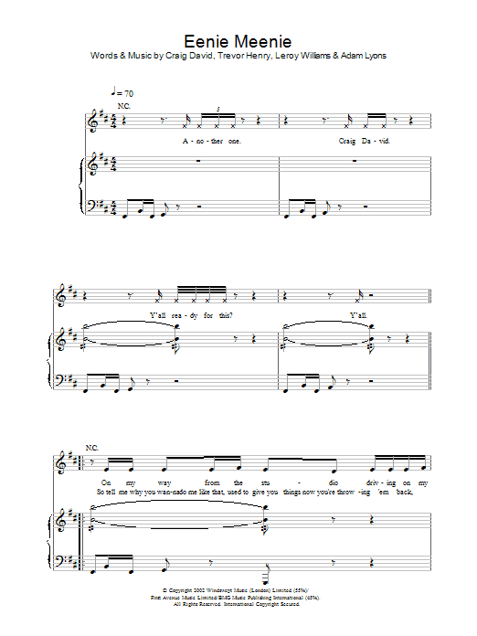 Download or print Craig David Eenie Meenie sheet music, chords and digital score arranged for Piano, Vocal & Guitar Chords. This Pop score includes 8 page(s).