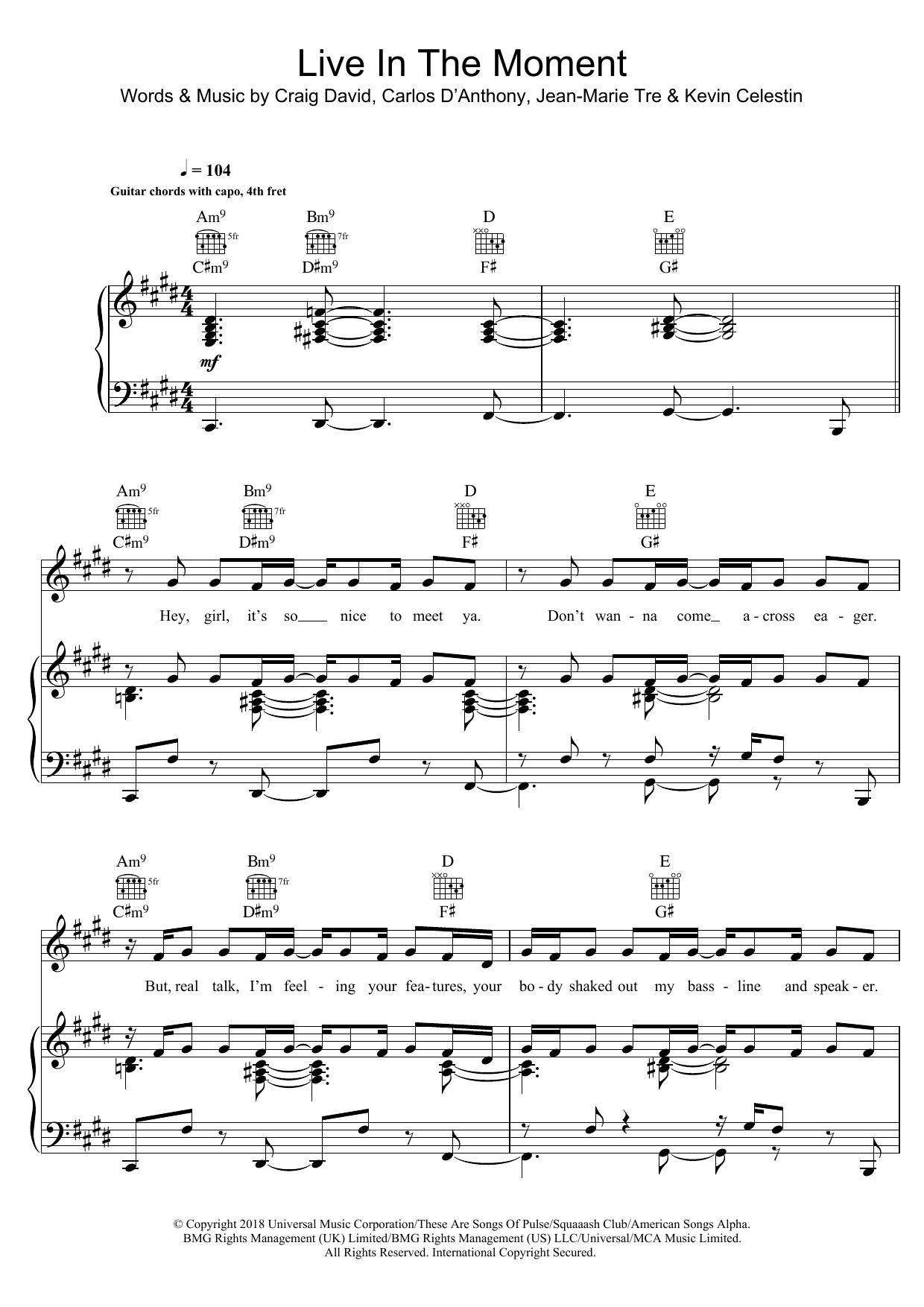 Download or print Craig David Live In The Moment (featuring GoldLink) sheet music, chords and digital score arranged for Piano, Vocal & Guitar Chords. This Pop score includes 10 page(s).