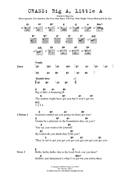 Download or print Crass Big A Little A sheet music, chords and digital score arranged for Guitar Chords/Lyrics. This Rock score includes 4 page(s).
