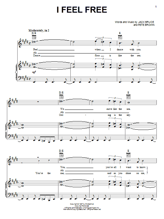 Download or print Cream I Feel Free sheet music, chords and digital score arranged for Piano, Vocal & Guitar Chords (Right-Hand Melody). This Pop score includes 4 page(s).