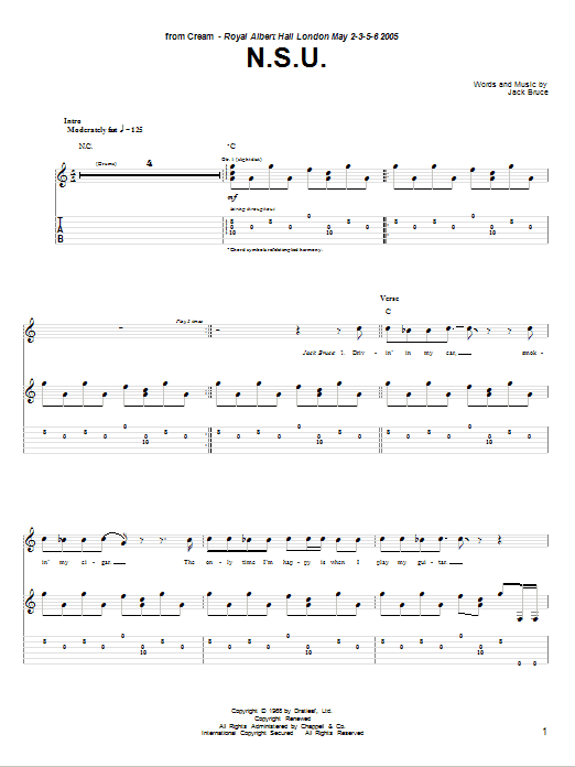 Download or print Cream N.S.U. sheet music, chords and digital score arranged for Guitar Tab. This Blues score includes 13 page(s).