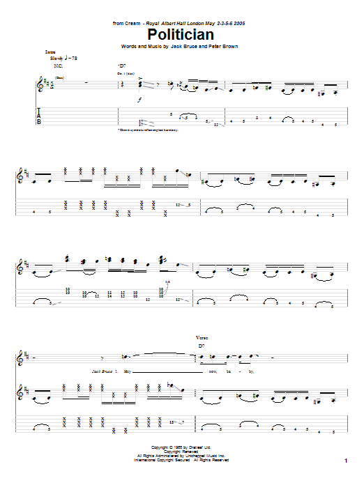 Download or print Cream Politician sheet music, chords and digital score arranged for Guitar Tab (Single Guitar). This Pop score includes 10 page(s).