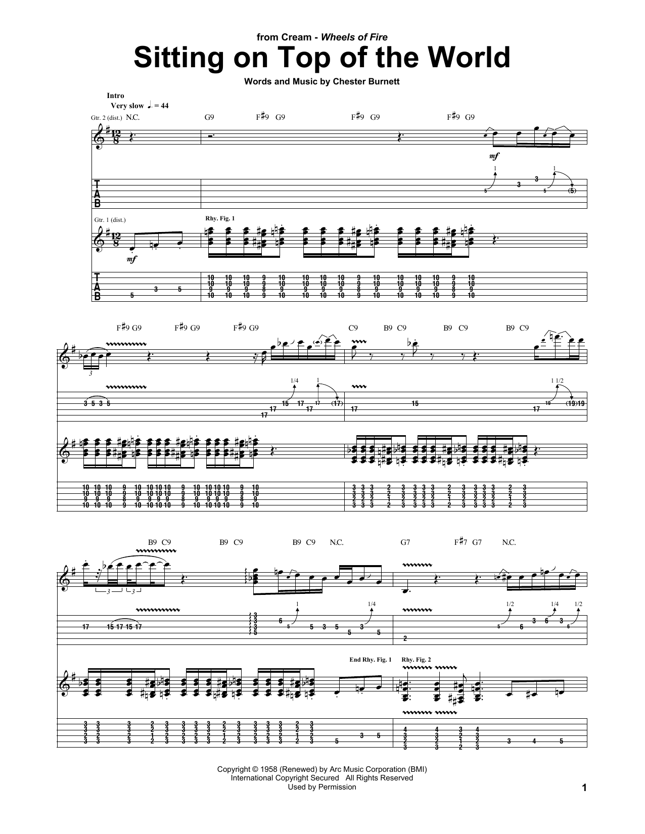 Download or print Cream Sitting On Top Of The World sheet music, chords and digital score arranged for Guitar Tab. This Pop score includes 8 page(s).